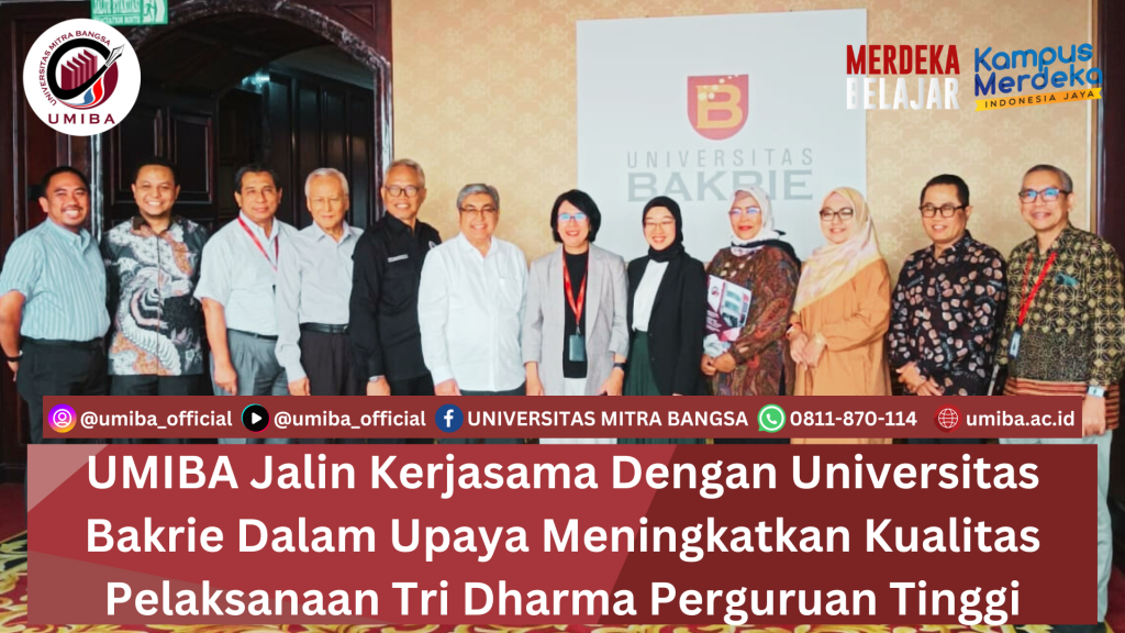 UMIBA melakukan kunjungan ke Universitas Bakrie pada 14 Agustus 2024 untuk melakukan penandatanganan nota kesepakatan antara Universitas Mitra Bangsa dengan Universitas Bakrie perihal kerjasama dalam implementasi Tri Dharma Perguruan Tinggi seperti penerapan pengabdian kepada masyarakat, penelitian, serta kuliah tamu antara kedua belah pihak.Diharapkan kerjasama antara kedua Perguruan Tinggi Swasta ini dapat memberikan peningkatan kualitas kepada […]